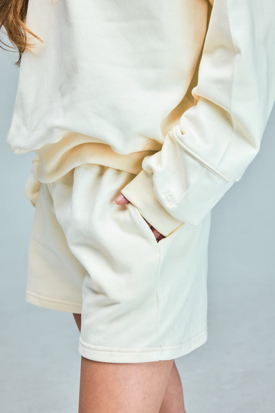 Detalle bordado JOY en bolsillo trasero.